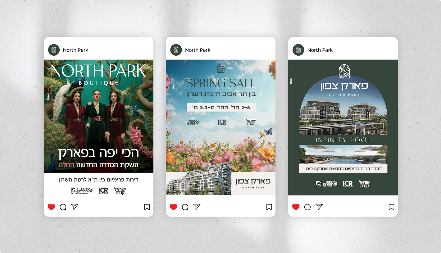 As the agency shaping the visual language of North Park, we developed a design approach that reflects the project’s balance between urban proximity and natural calm. Located between Tel Aviv and Ramat Hasharon, the neighborhood introduces an elegant residential environment defined by botanical architecture, shared community spaces, and a central piazza. Our work captures this unique positioning, presenting North Park as a refined residential reserve that combines the energy of the city with the tranquility of a green landscape.